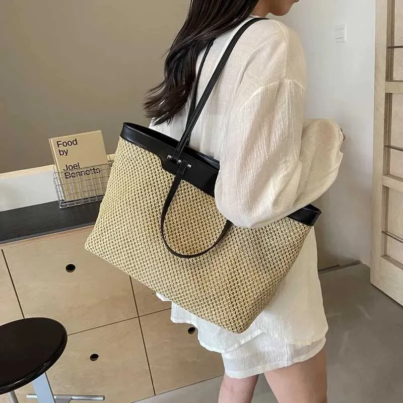 Large Capacity Straw Bags Women Fashion Patchwork Woven Tote Bag Basket Handbags Female Casual Shopping Shoulder Bag