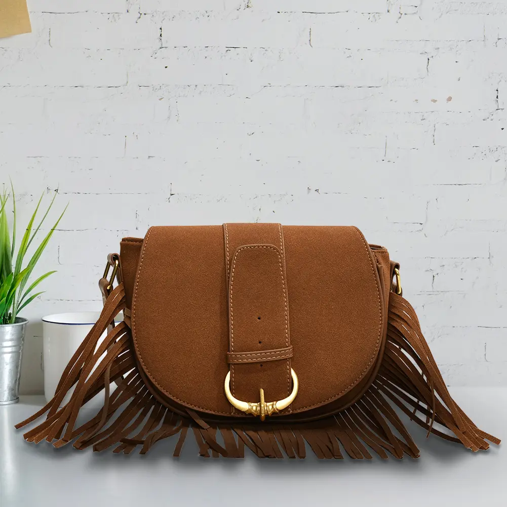 Women Suede Crossbody Bag With Tassels Shoulder Bag Zipper Closure Handbag Satchel Bag For Work Travel