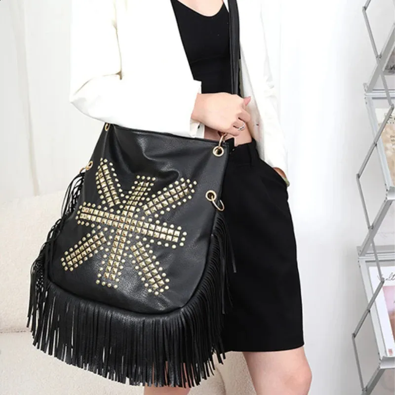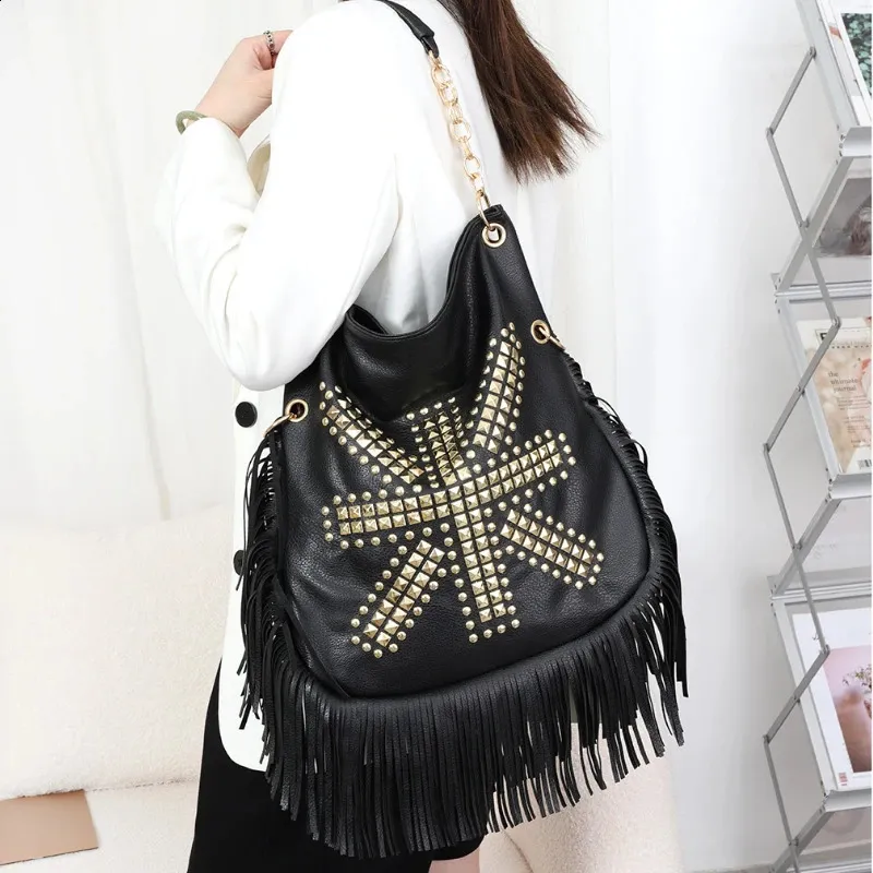 Trendy Fashion Punk Casual High-capacity Rivet Tassel Shoulder Soft Leather Women