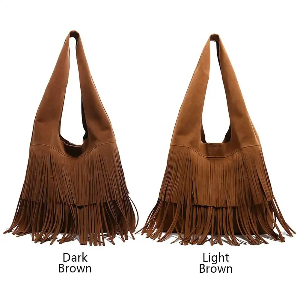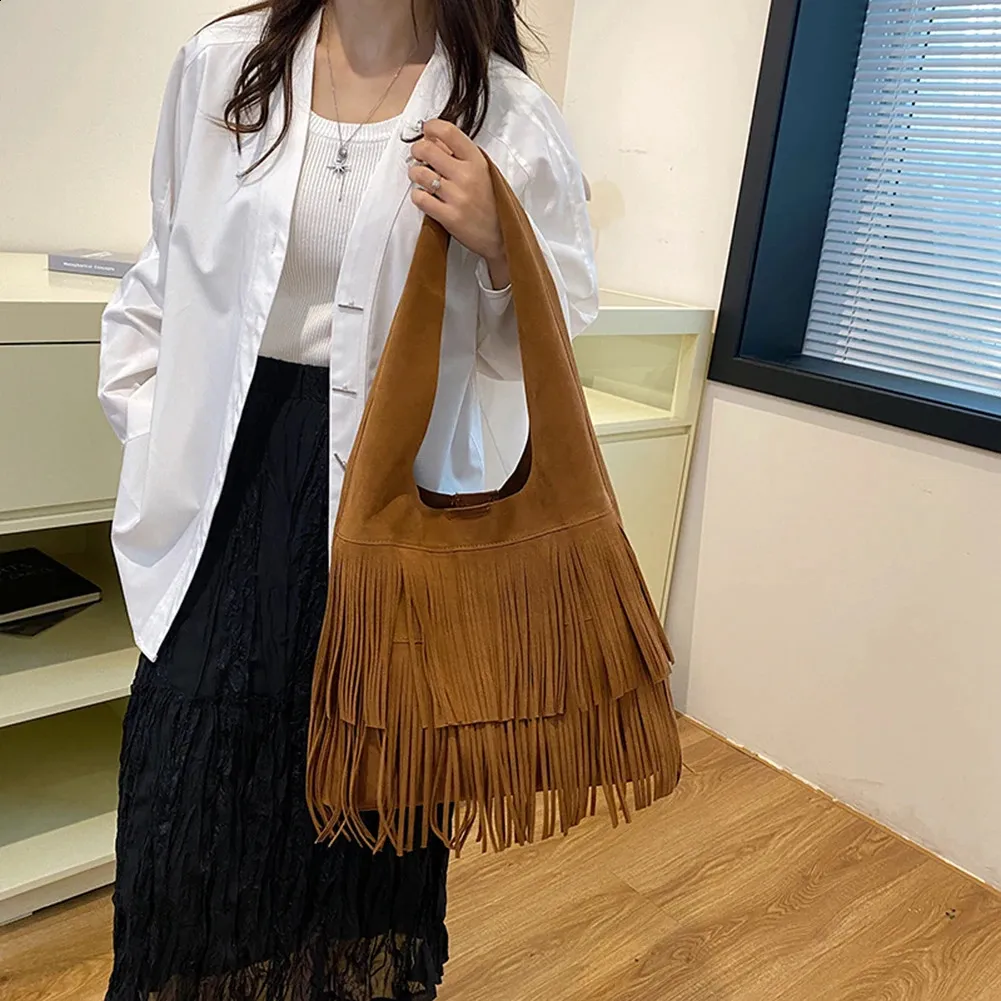 Women Suede Fringe Messenger Bag Tote Large Capacity Tassel Shoulder Bag Retro Vintage Bag Solid Color